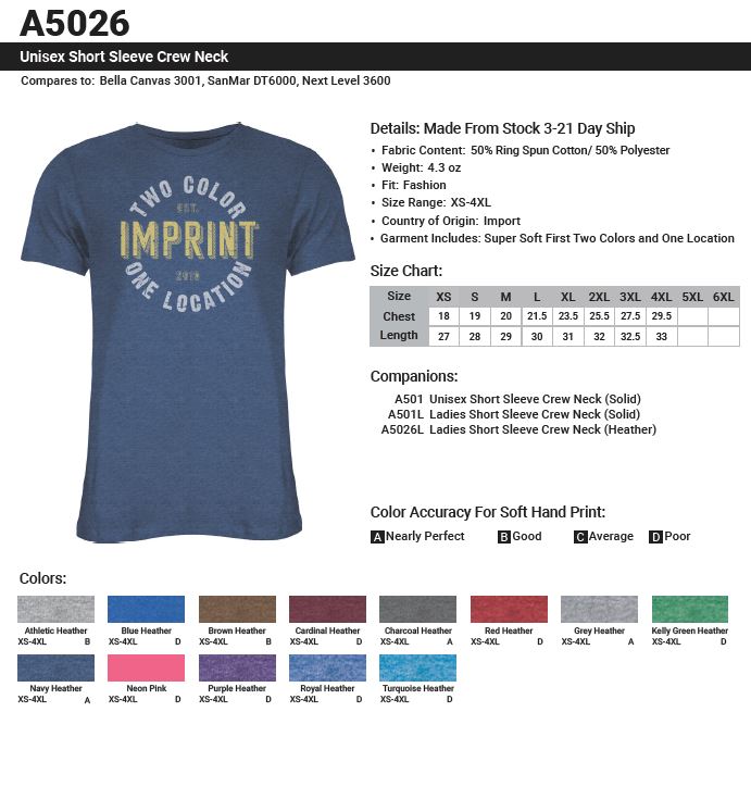 - Heather CVC/Blend Colors: 52/48 Airlume combed and ring spun cotton/poly